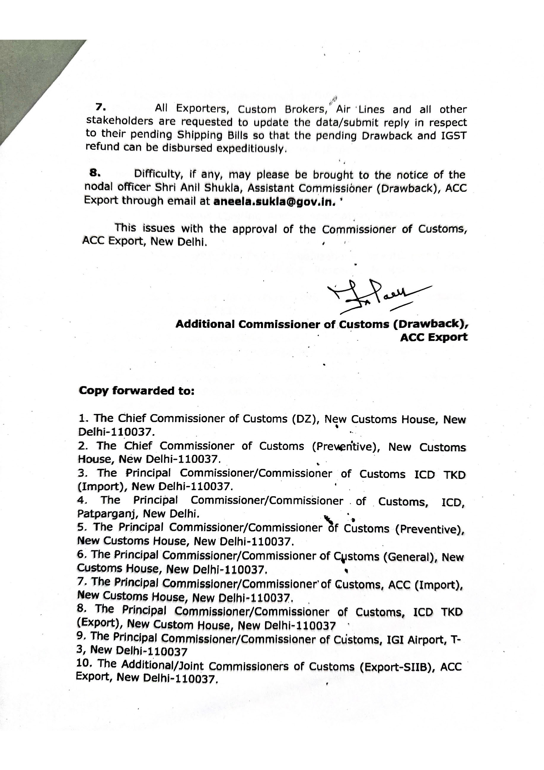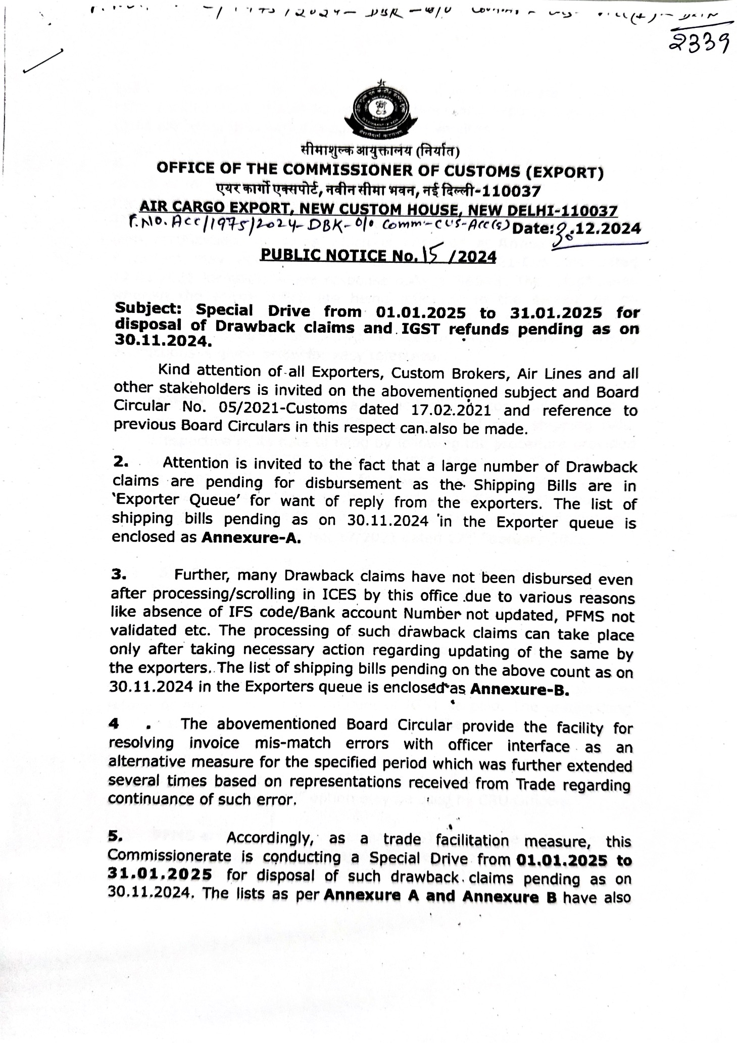 Special Drive from 01.01.2025 to 31.01.2025 for disposal of drawback claims and IGST refinds pending as on 30.11.2024