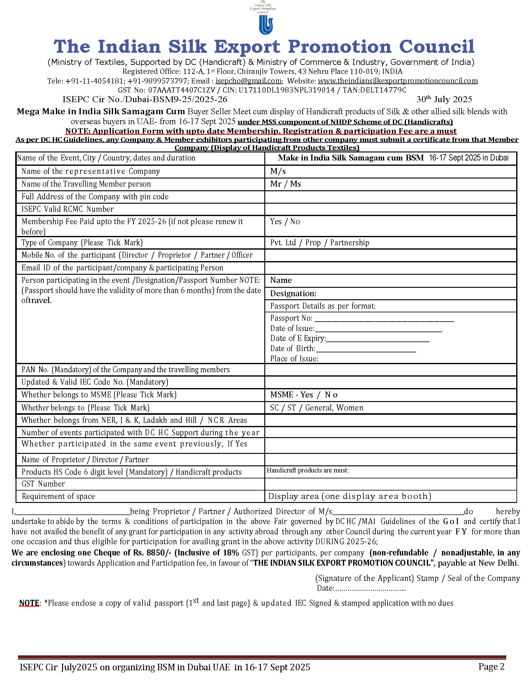 Invitation to participate in Make in India Silk Samagam Cum Buyer Seller Meet cum display of Handicraft products of Silk & other allied silk blends with overseas buyers in UAE- from 16-17 Sept 2025 at Hyatt Regency Dubai