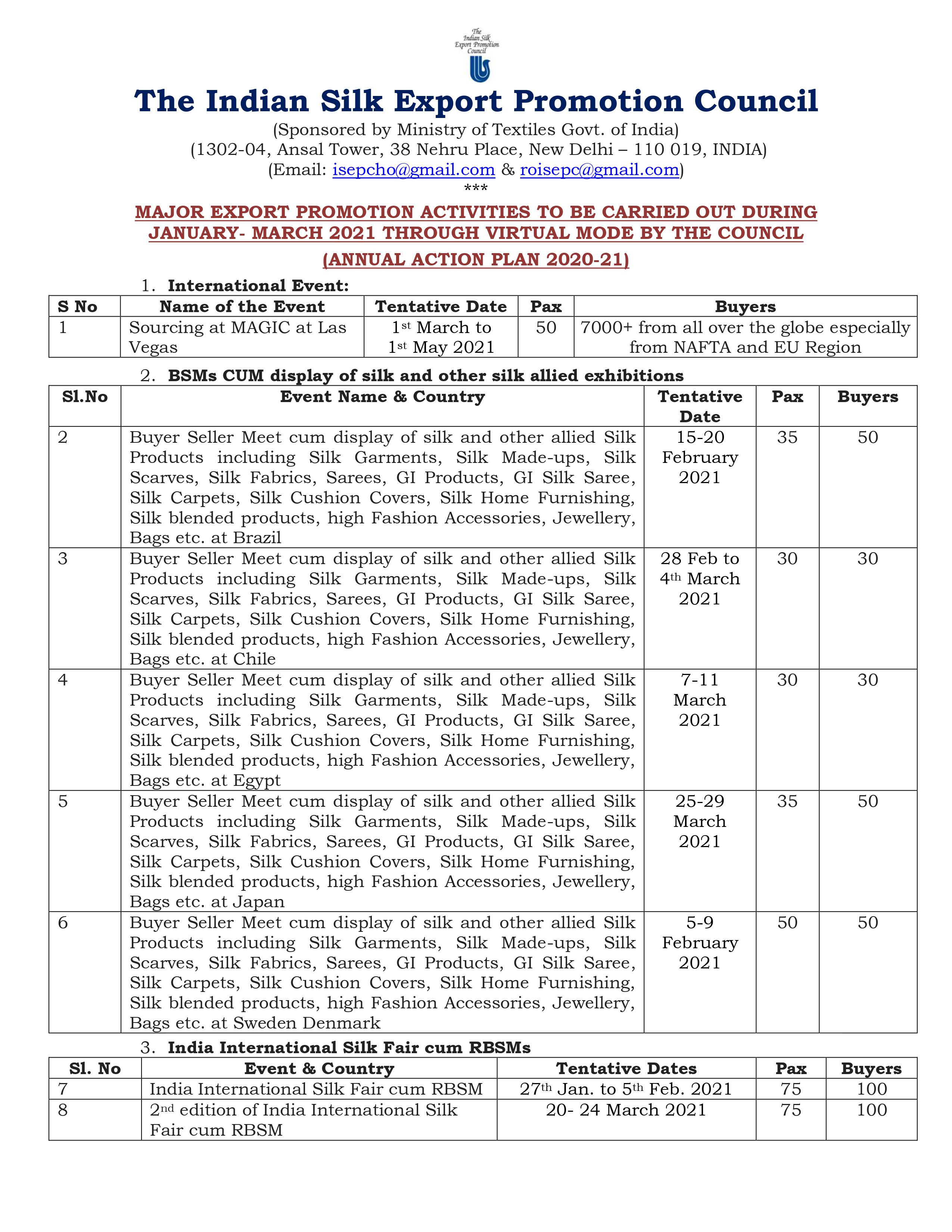 Major Export Promotion Activities to be Carried Out During January- March 2021 Through Virtual Mode by the Council