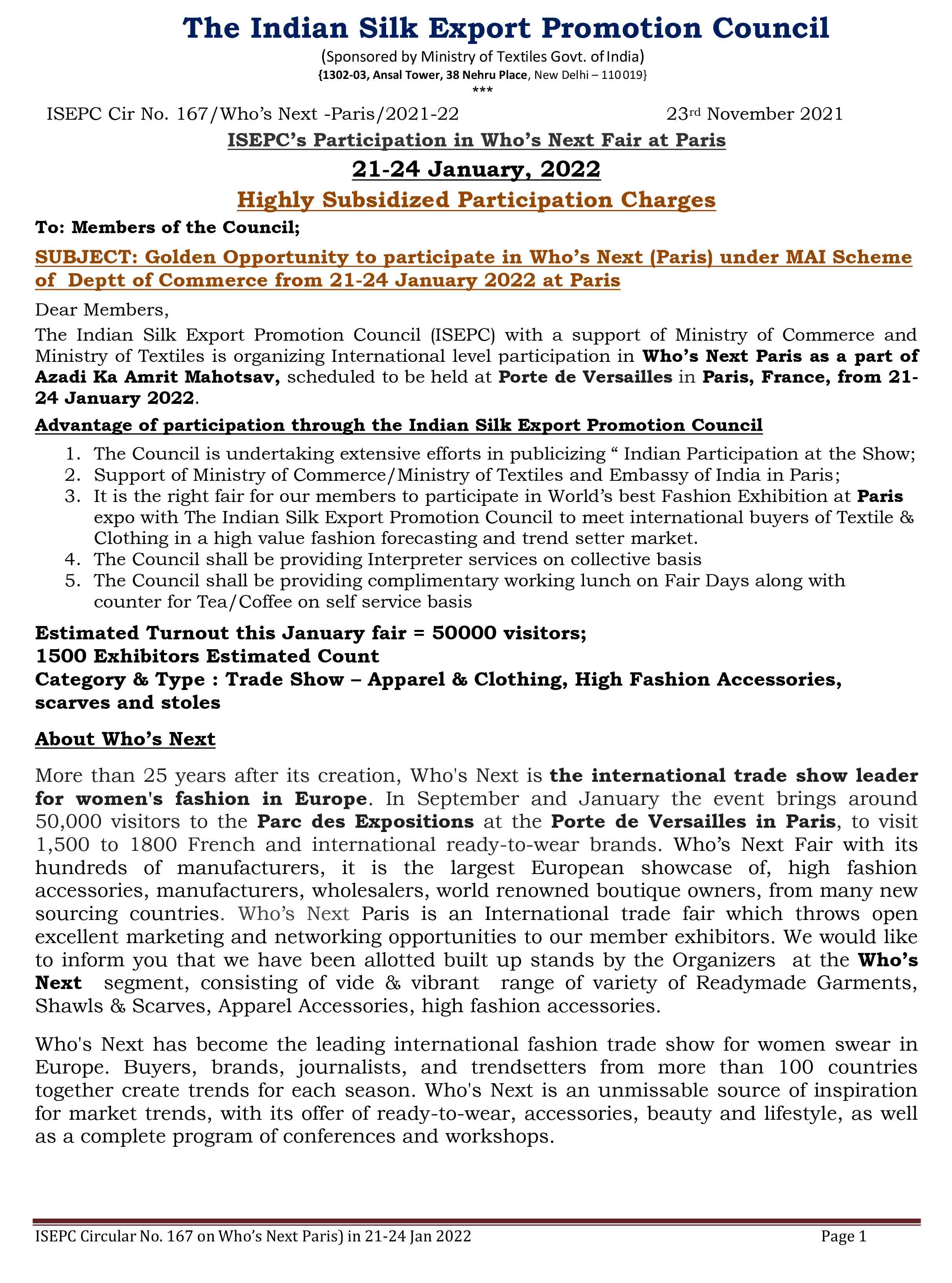 Participate in Who’s Next (Paris) under MAI Scheme of Deptt of Commerce from 21-24 January 2022 at Paris