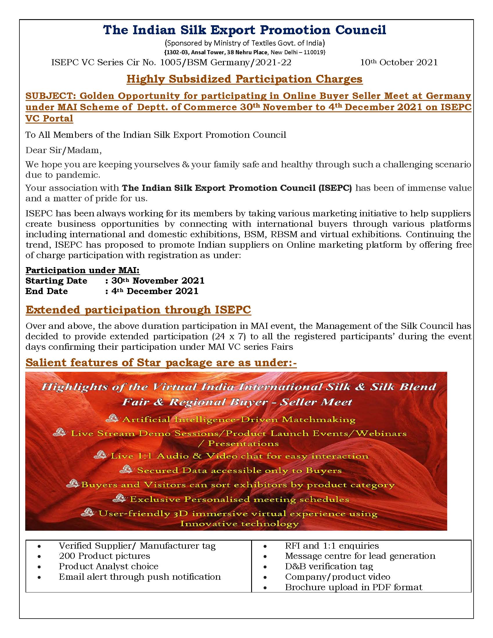 Participating in Online Buyer Seller Meet at Germany under MAI Scheme of Deptt. of Commerce 30th November to 4th December 2021