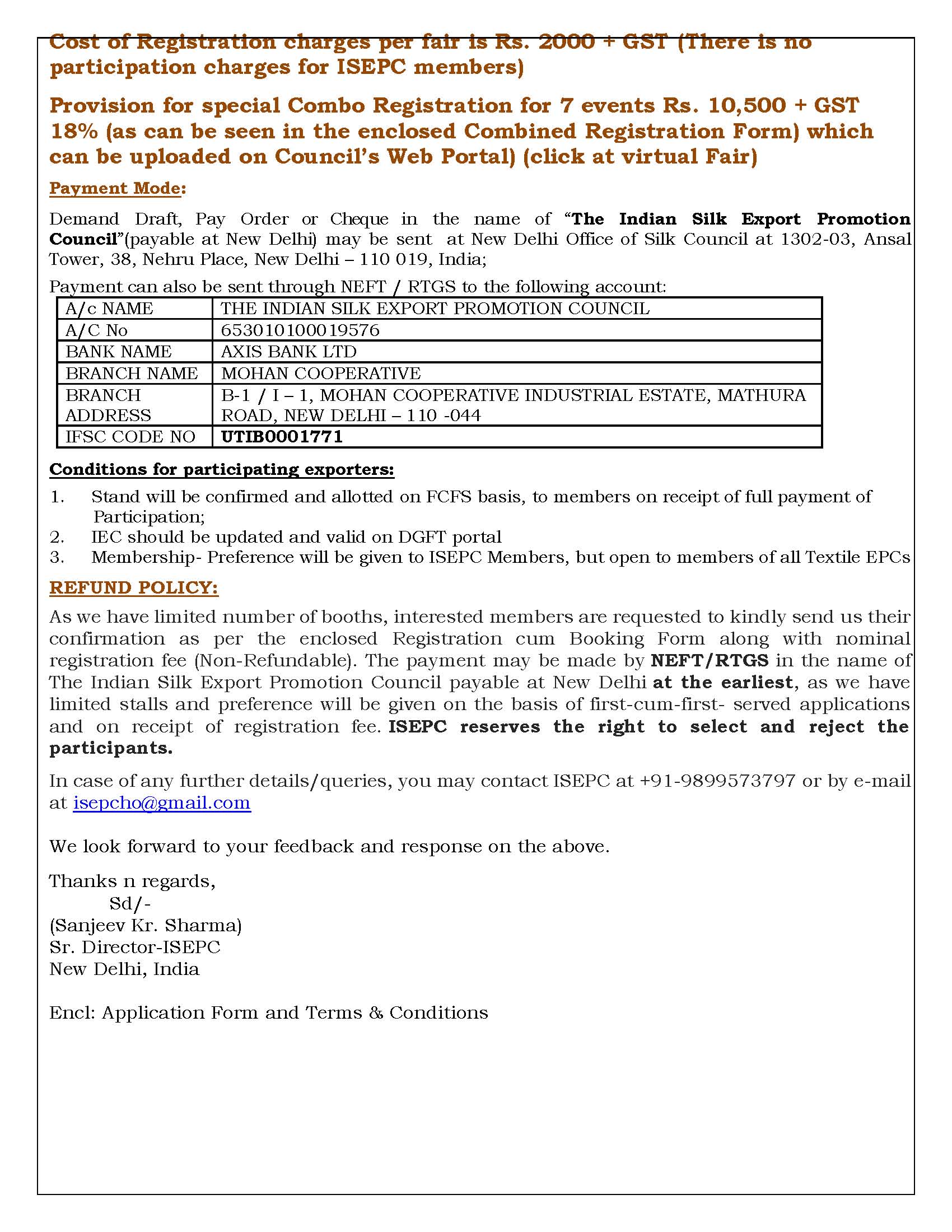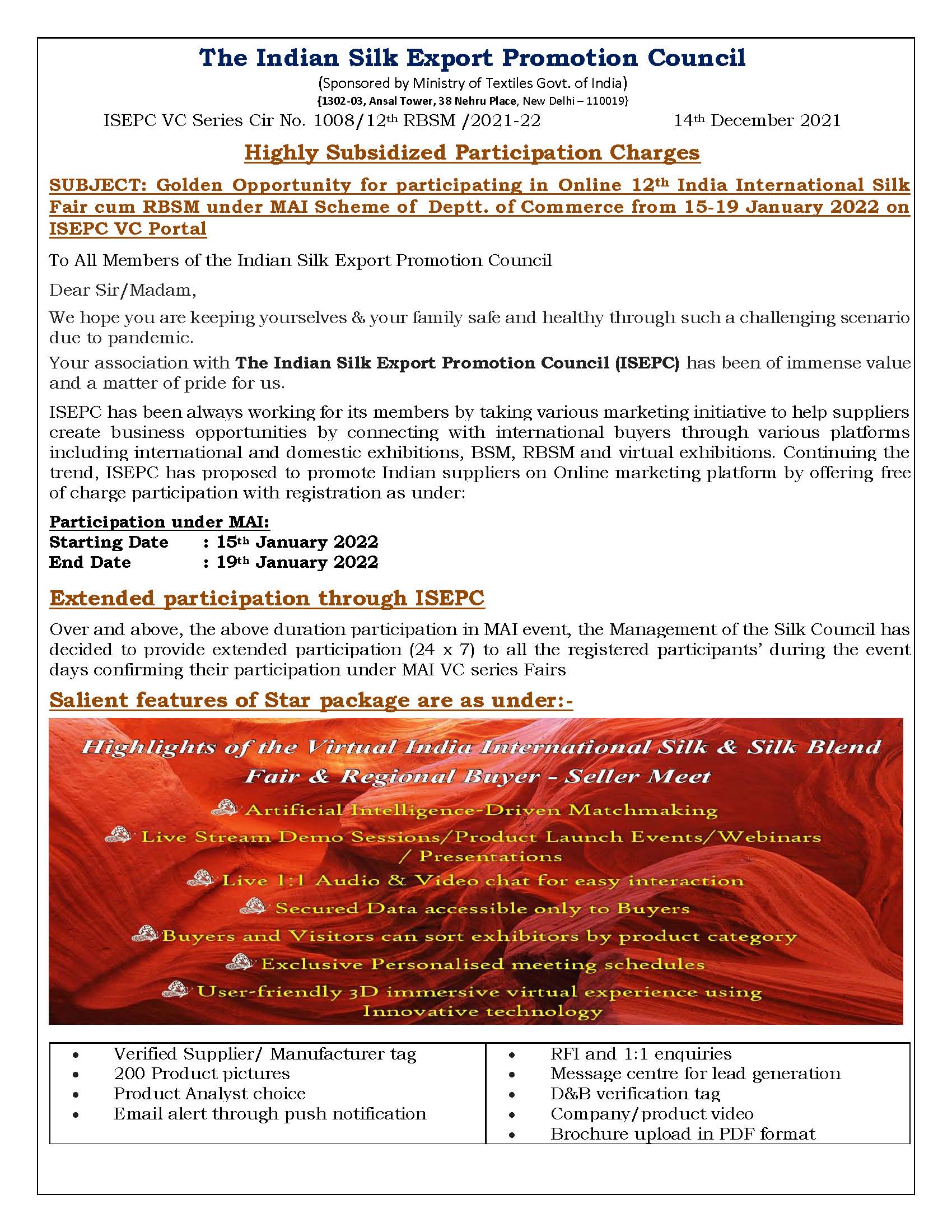 Participating in Online 12th India International Silk Fair cum RBSM under MAI Scheme of Deptt. of Commerce from 15-19 January 2022