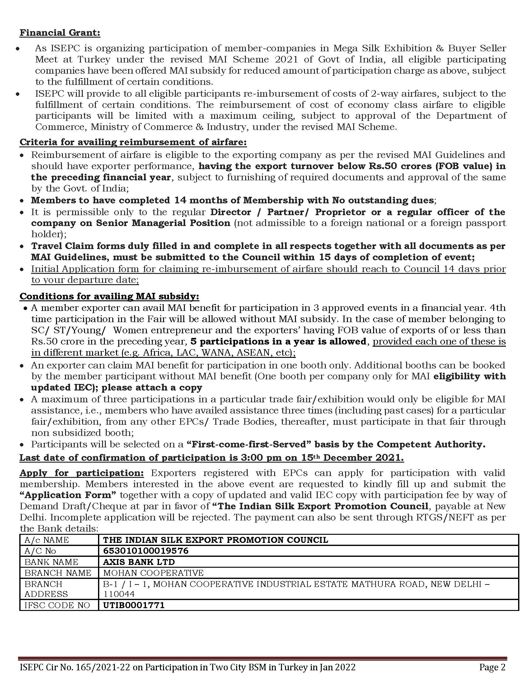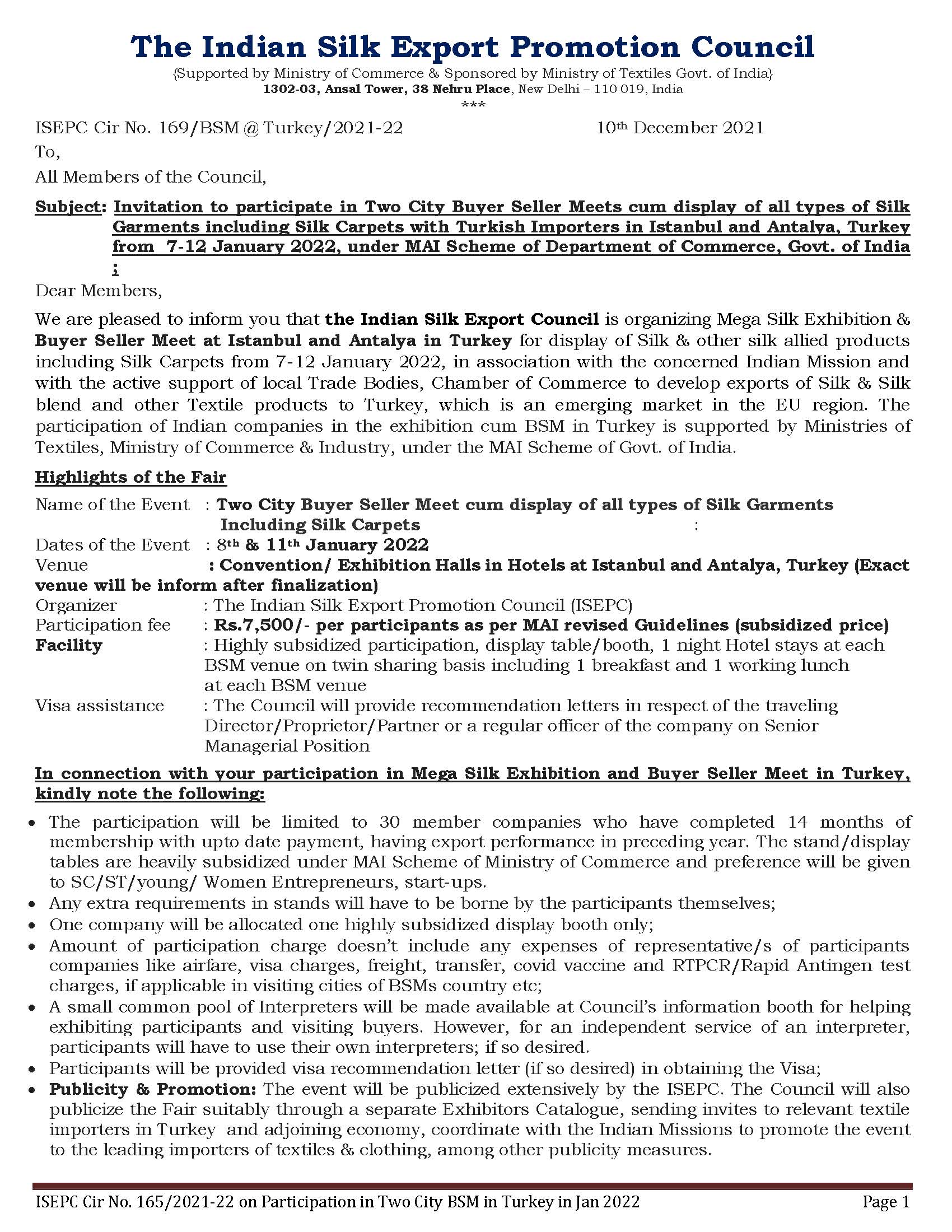 Participate in Two City Buyer Seller Meets cum display of all types of Silk Garments including Silk Carpets with Turkish Importers in Istanbul and Antalya, Turkey from 7-12 January 2022