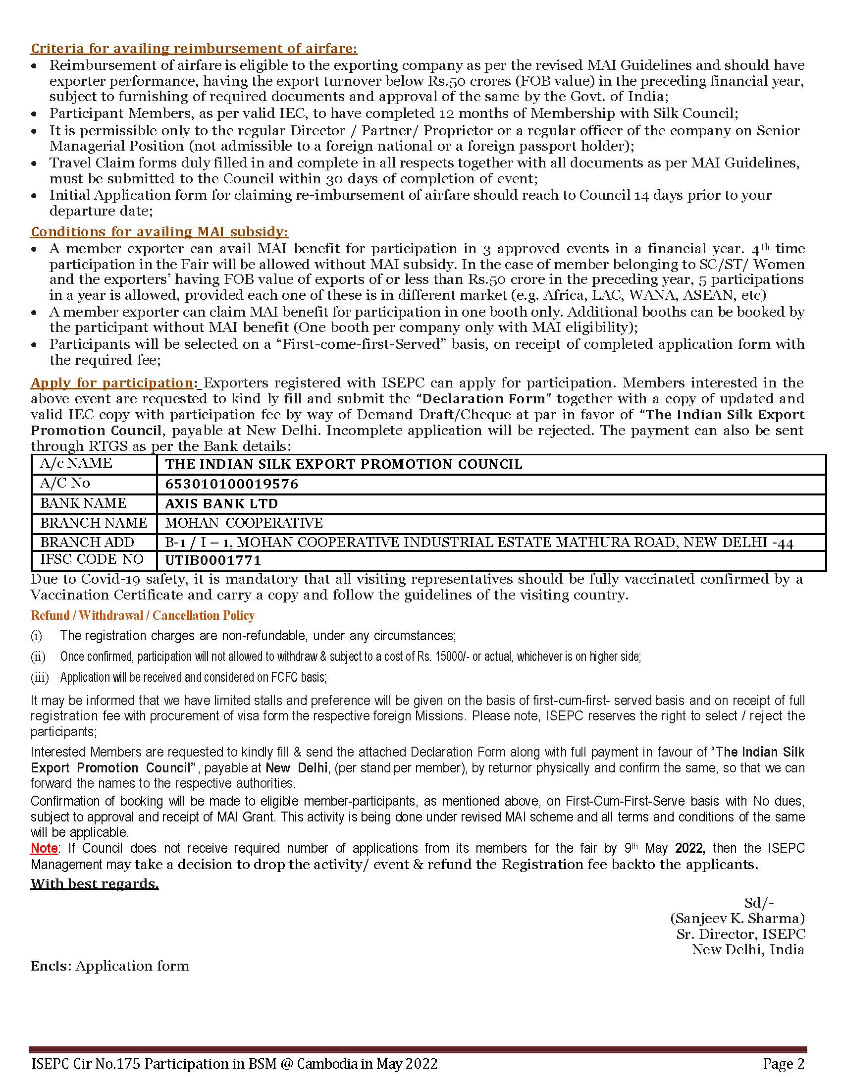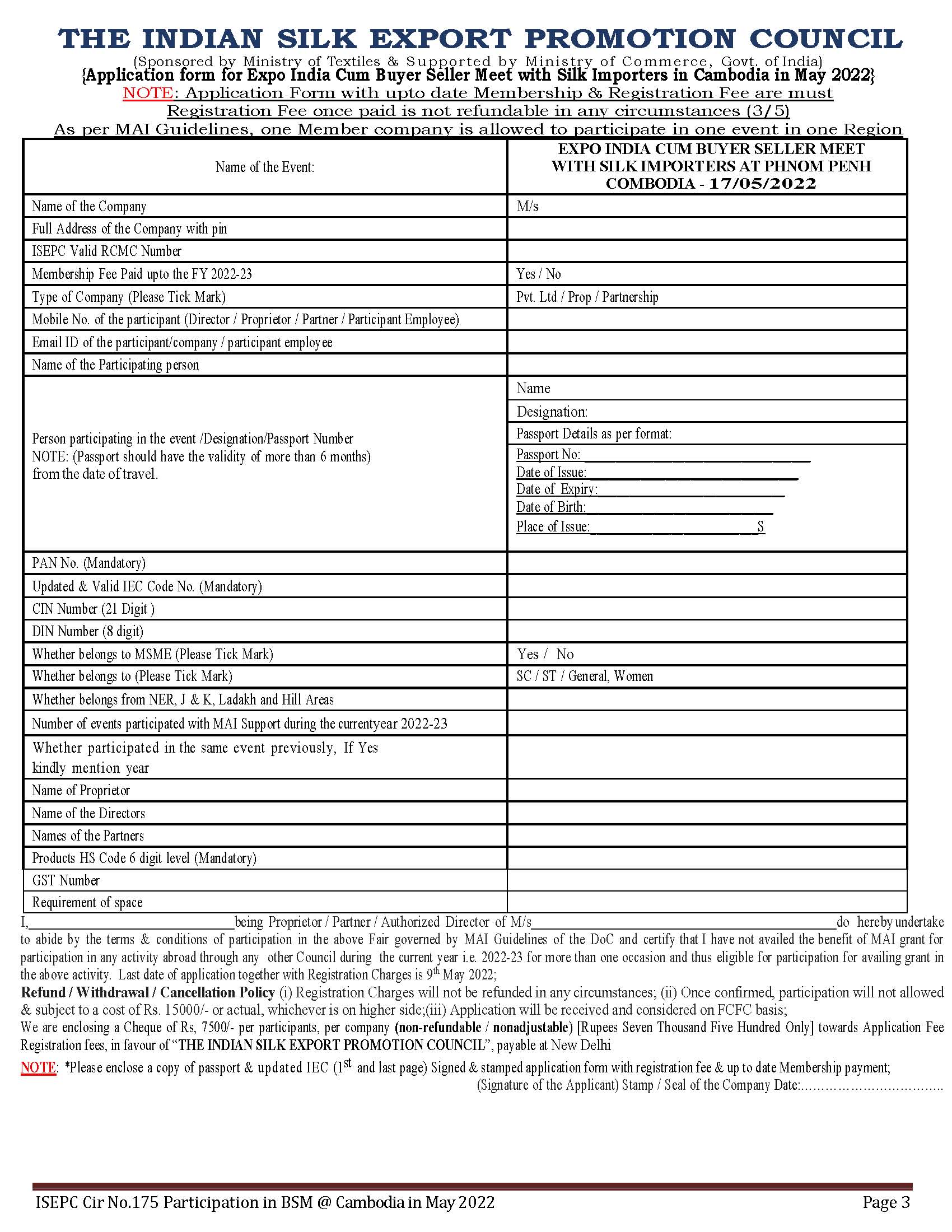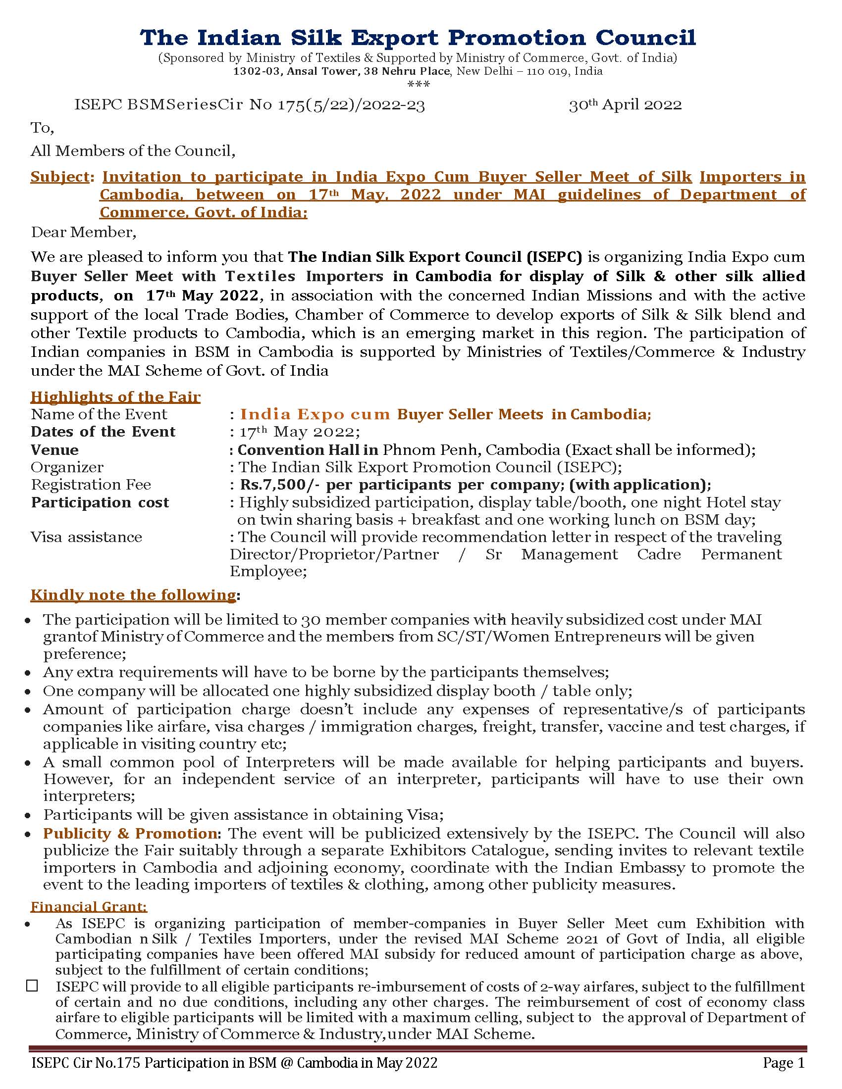 Participate in India Expo Cum Buyer Seller Meet of Silk Importers in Cambodia, between on 17th May, 2022