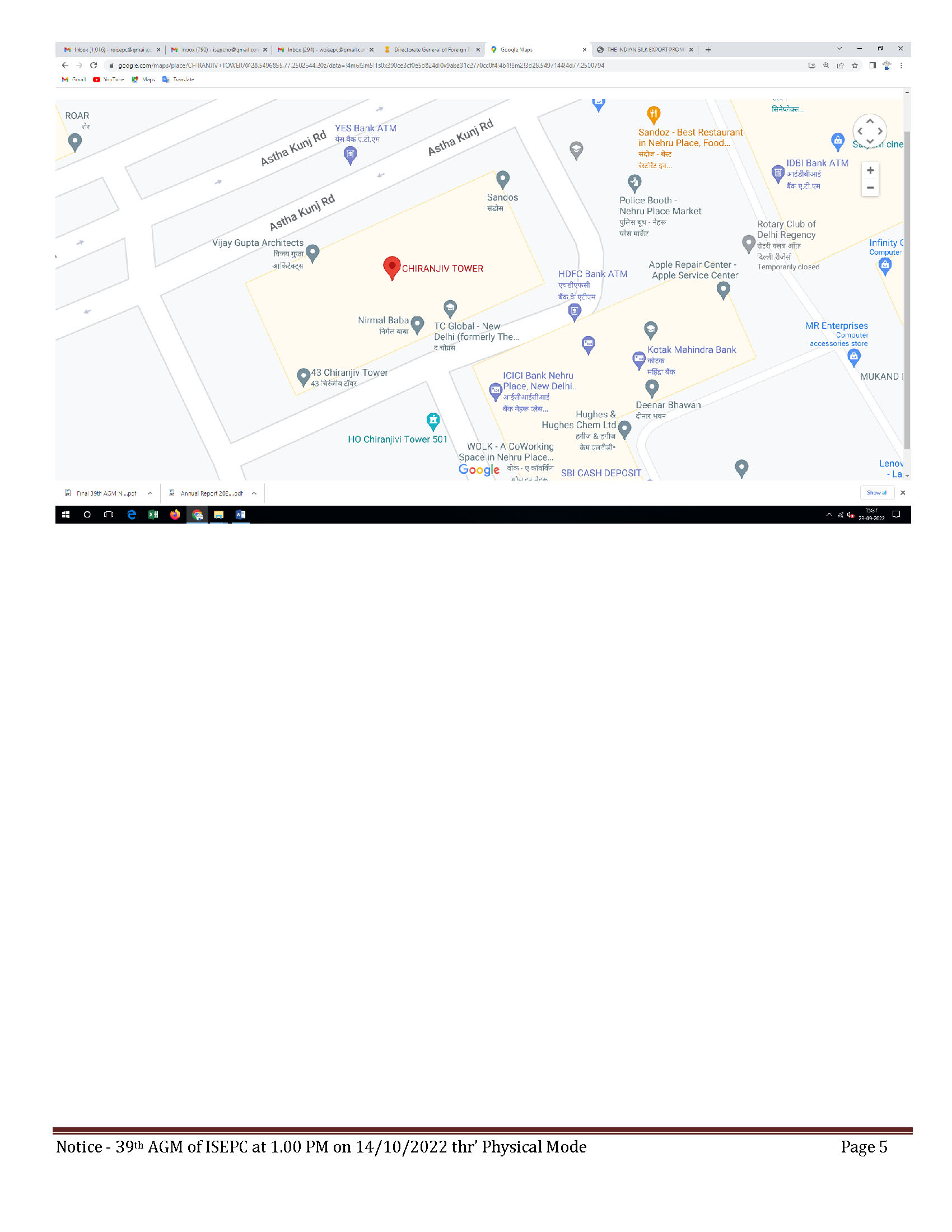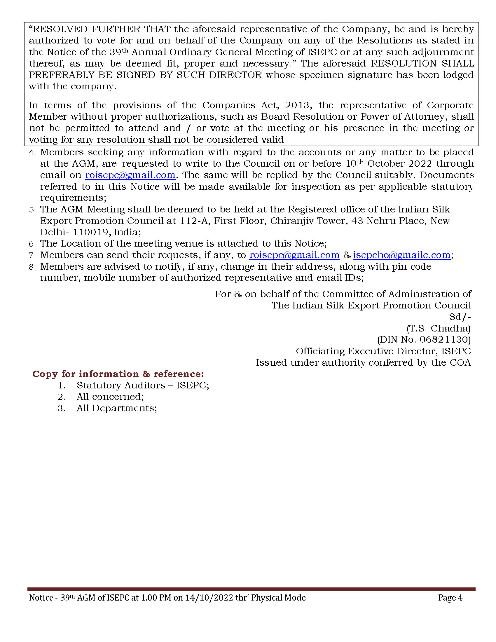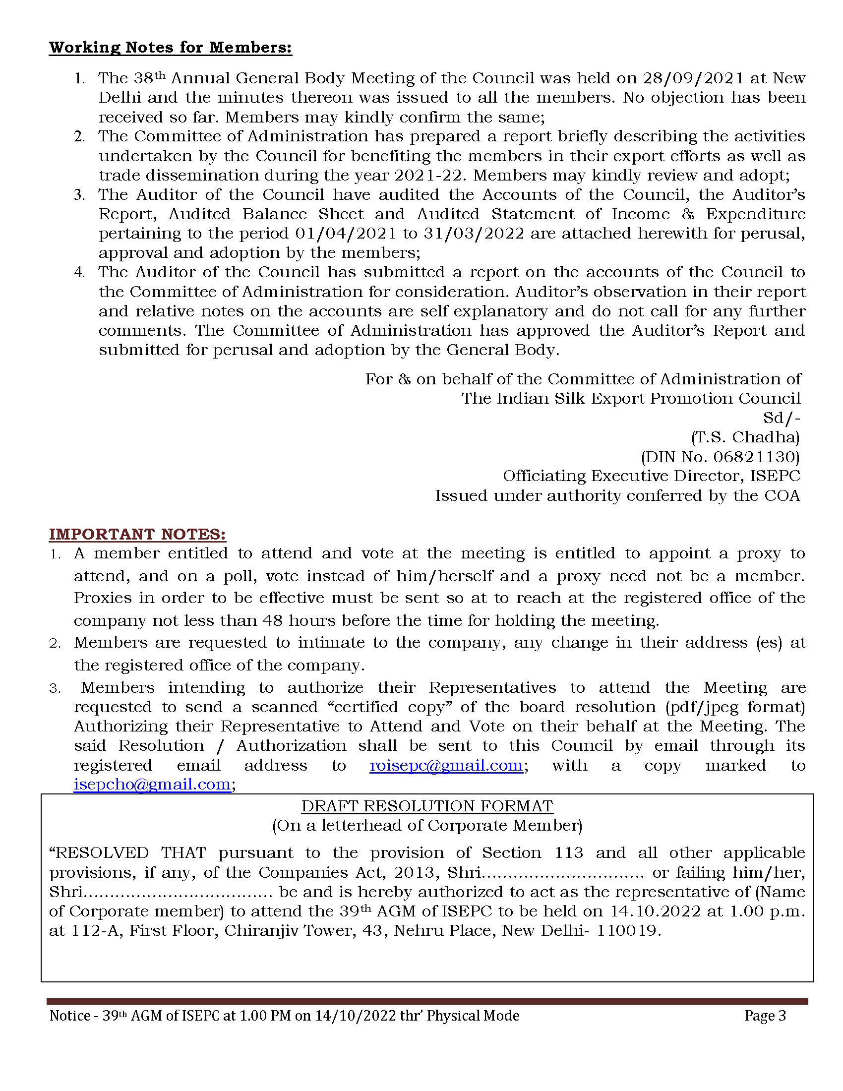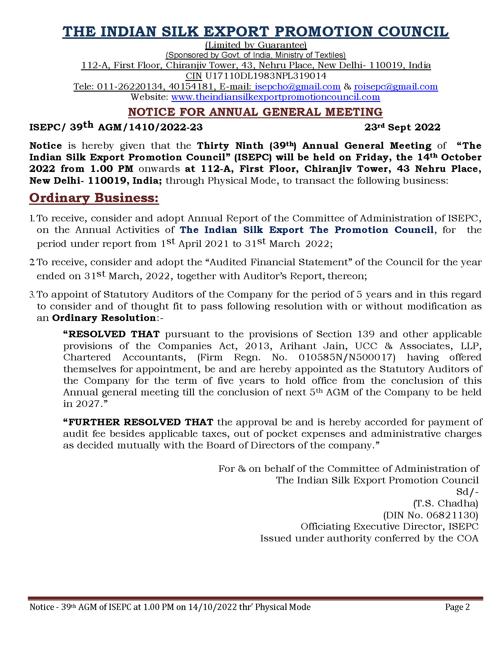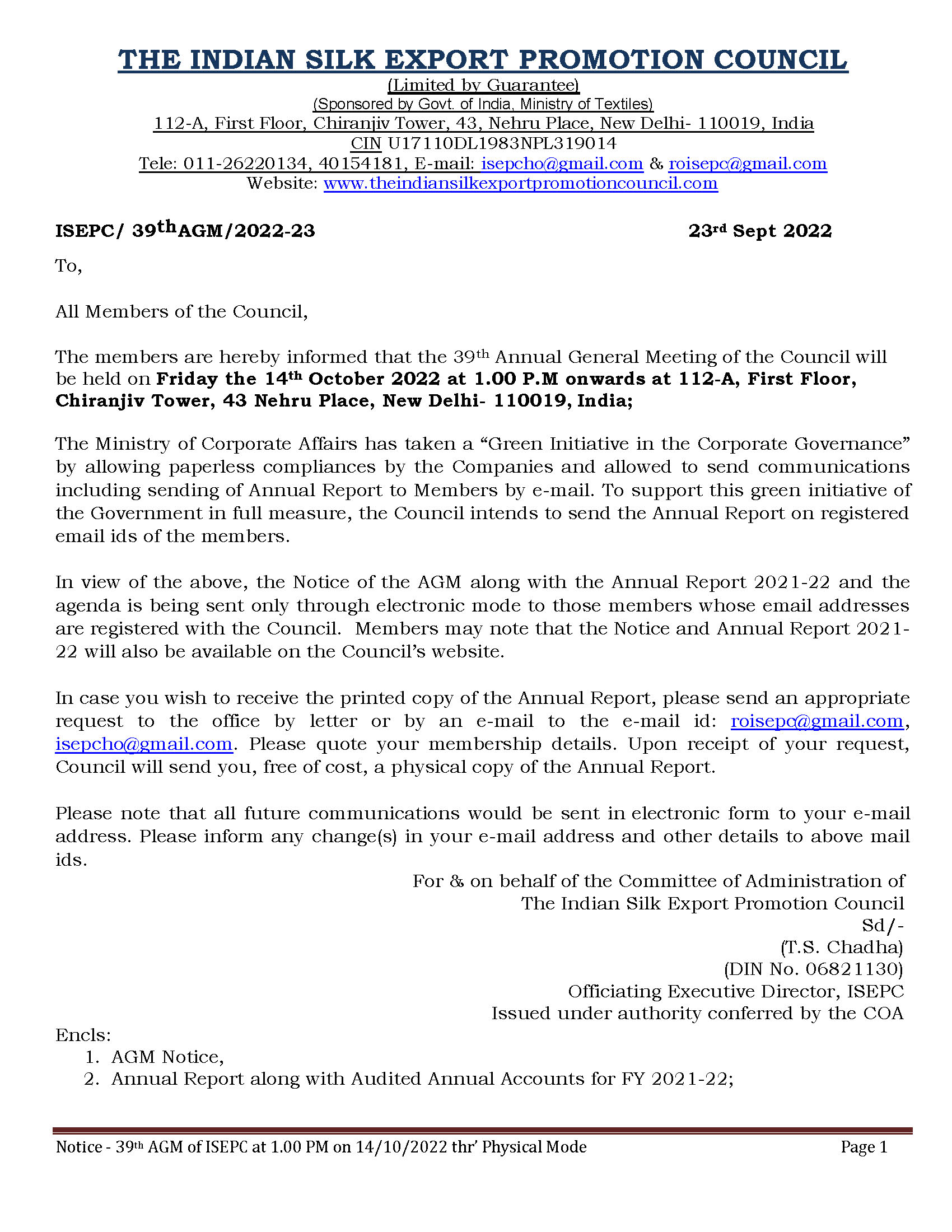 39th Annual General Meeting of the Council will be held on Friday the 14th October 2022 at 1.00 P.M onwards