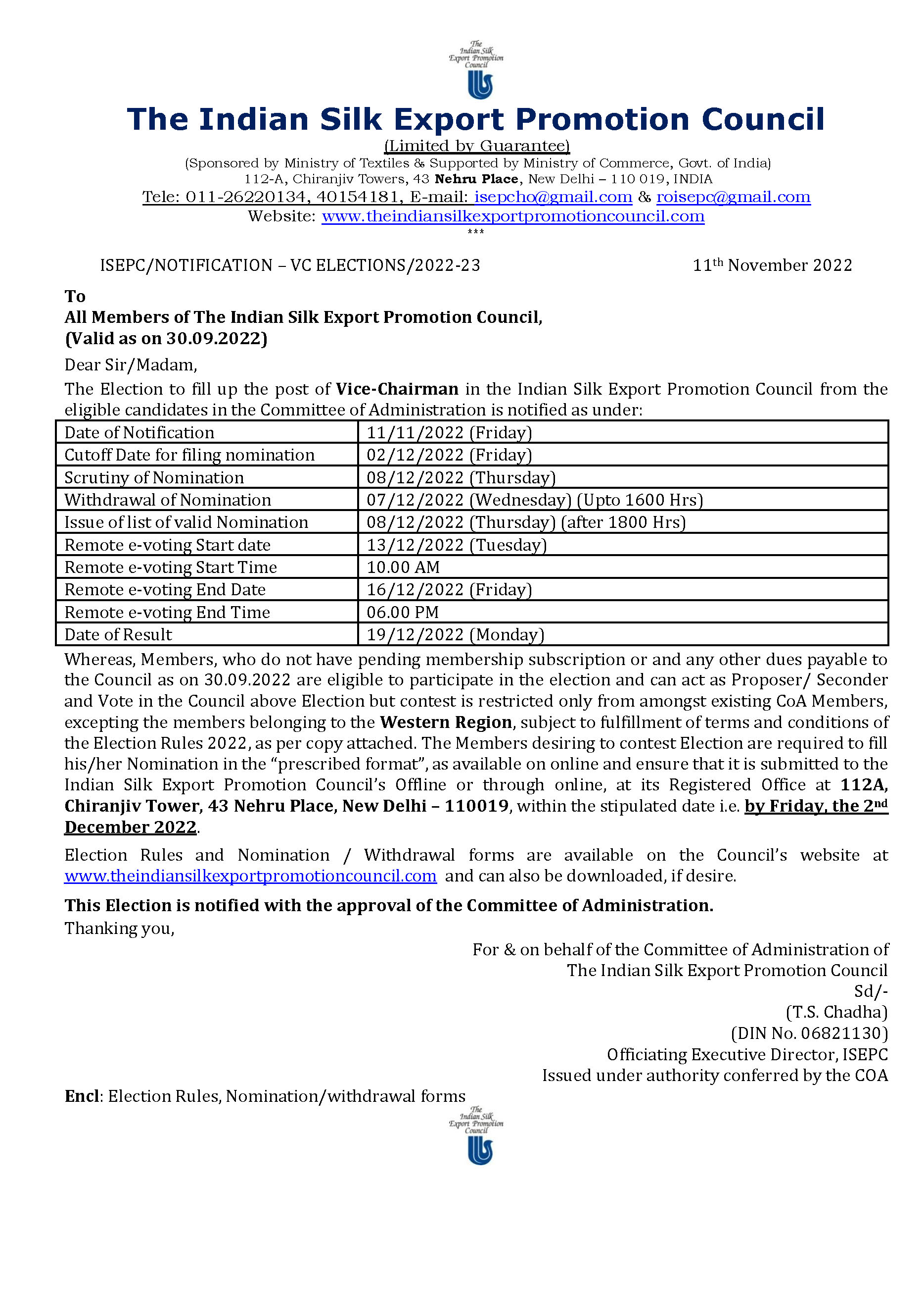 The Election to fill up the post of Vice-Chairman in the Indian Silk Export Promotion Council from the eligible candidates in the Committee of Administration