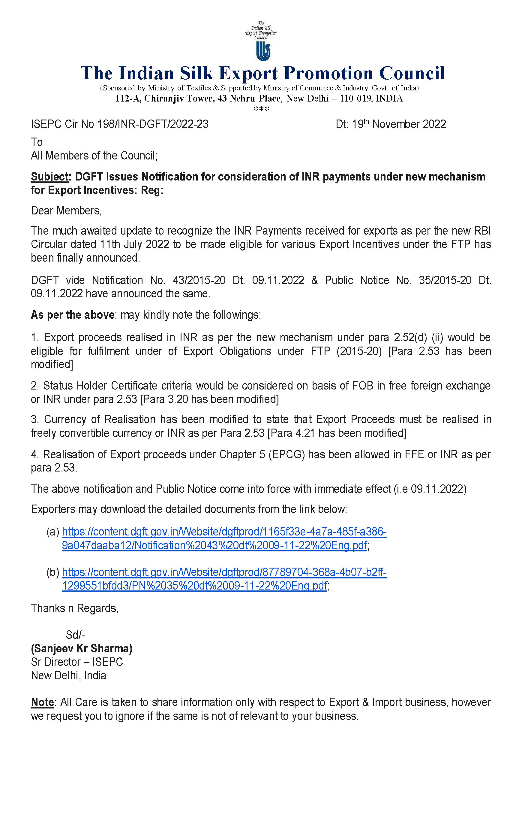 DGFT Issues Notification for consideration of INR payments under new mechanism for Export Incentives