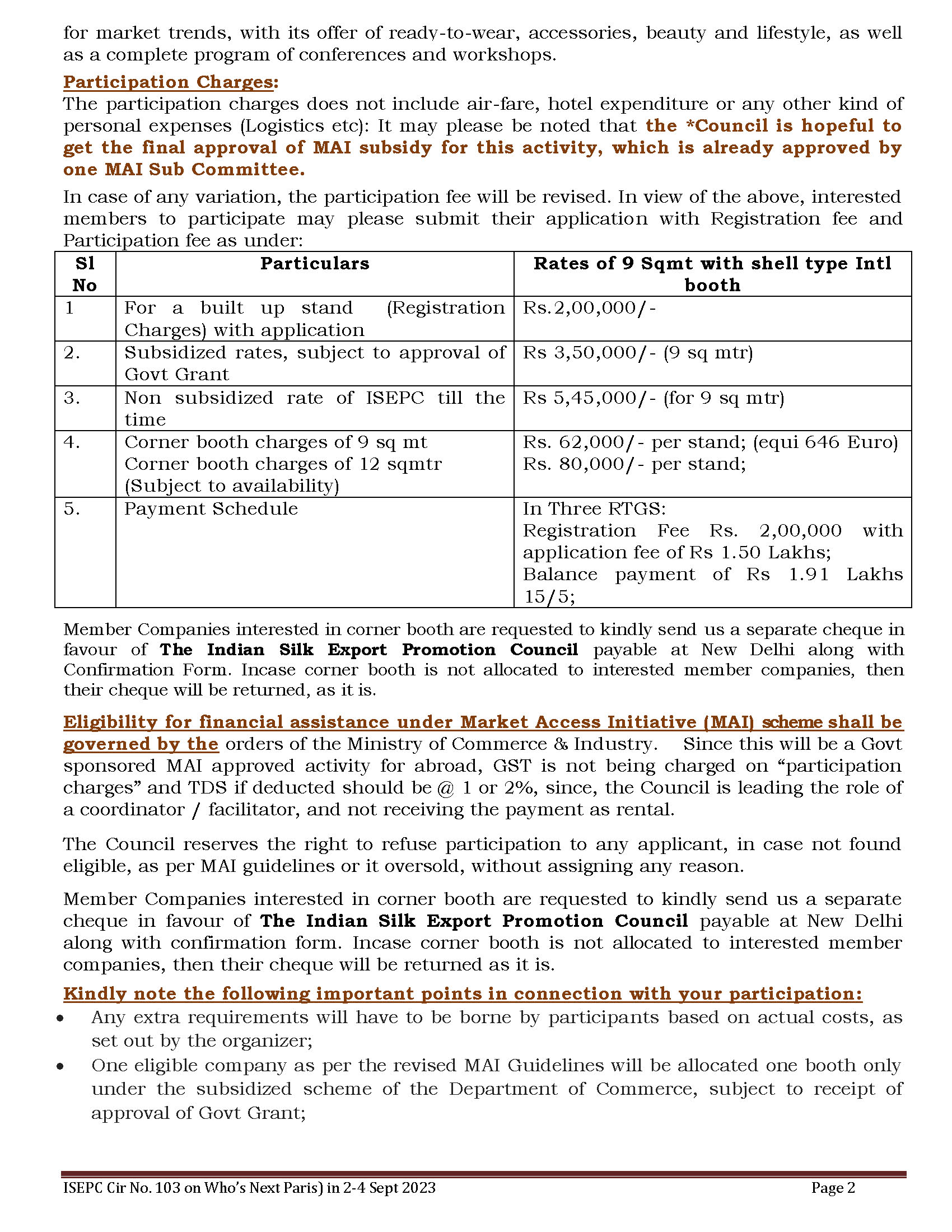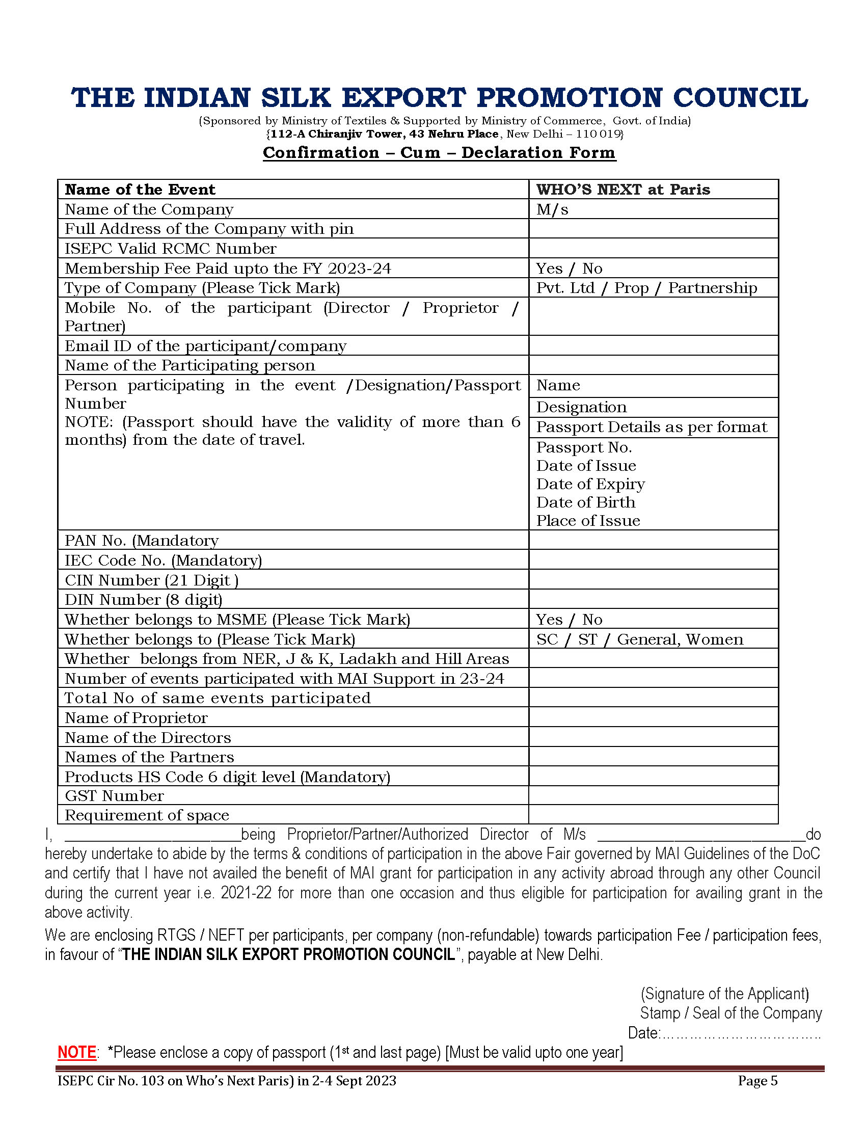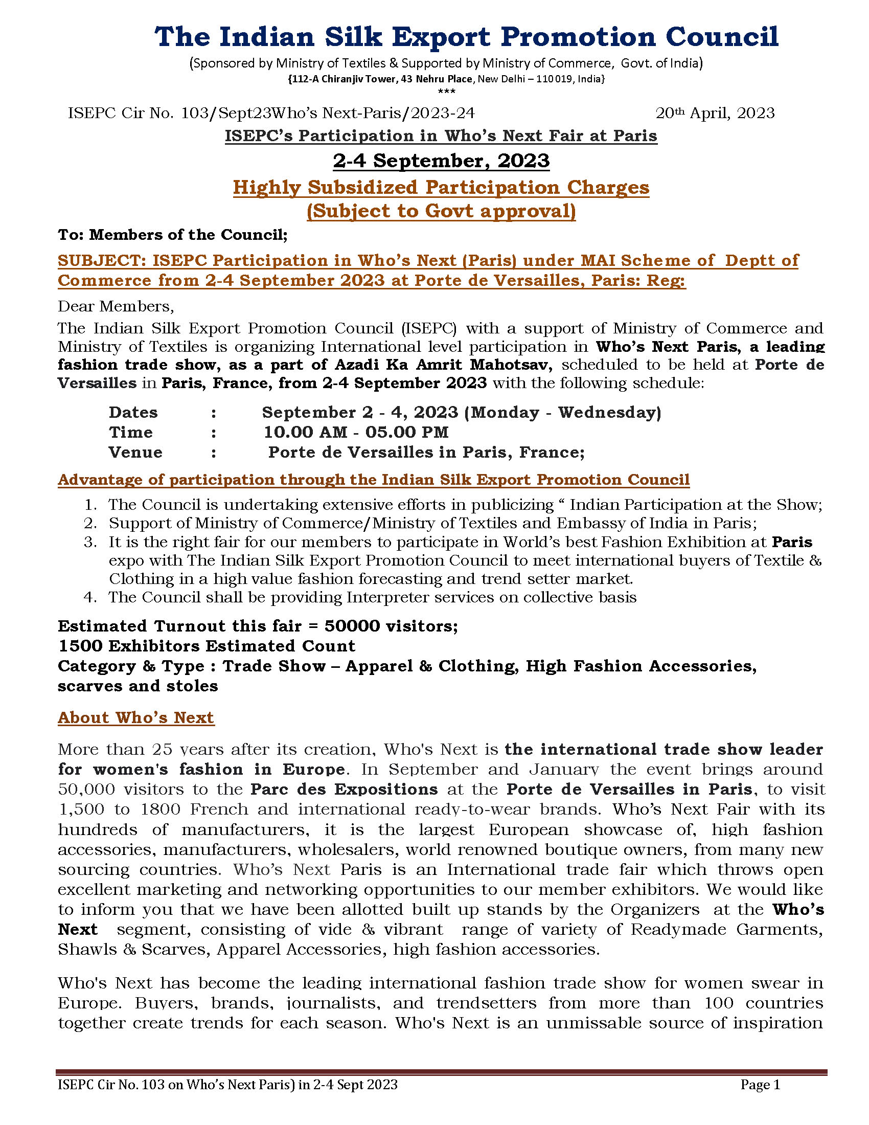 ISEPC Participation in Who’s Next (Paris) under MAI Scheme of Deptt of Commerce from 2-4 September 2023 at Porte de Versailles, Paris