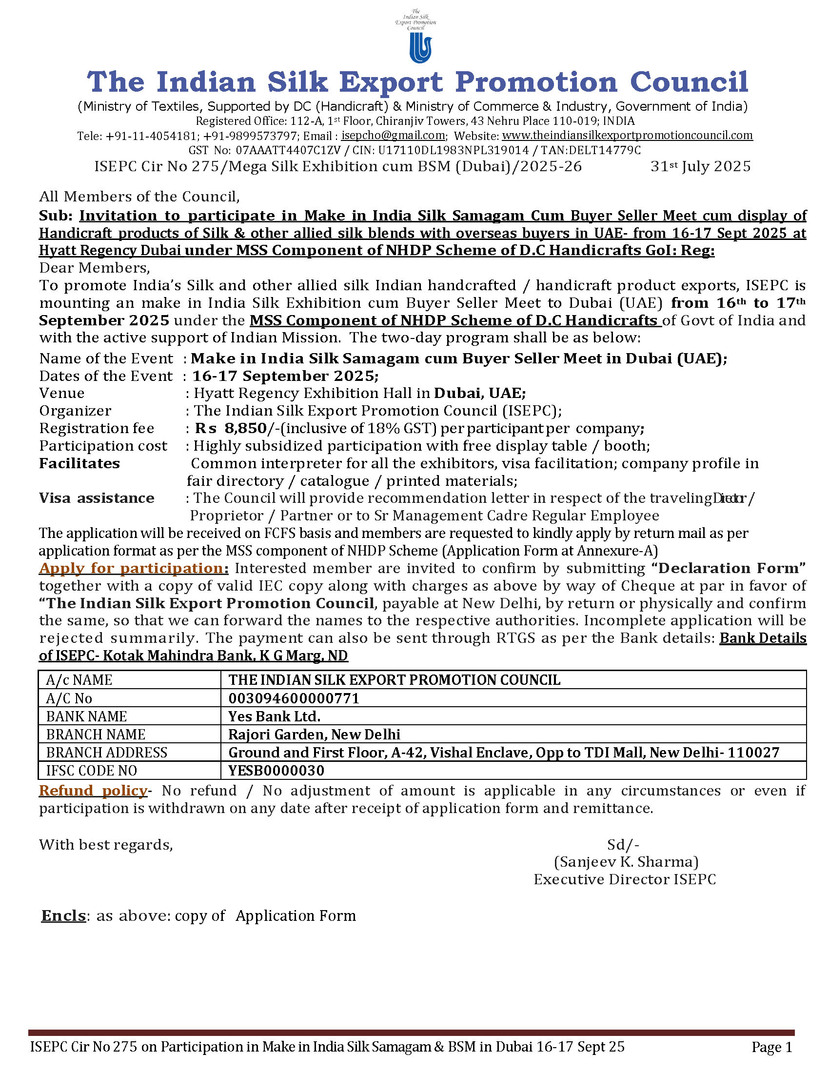 Invitation to participate in Make in India Silk Samagam Cum Buyer Seller Meet cum display of Handicraft products of Silk & other allied silk blends with overseas buyers in UAE- from 16-17 Sept 2025 at Hyatt Regency Dubai